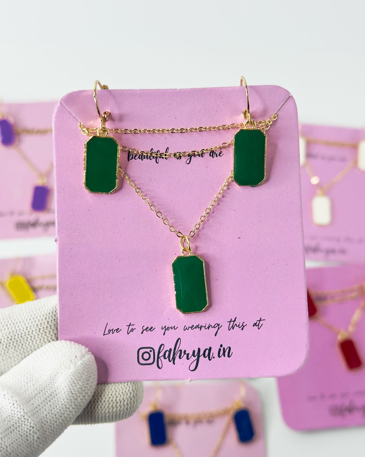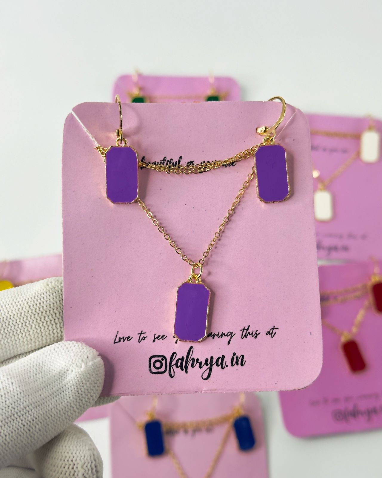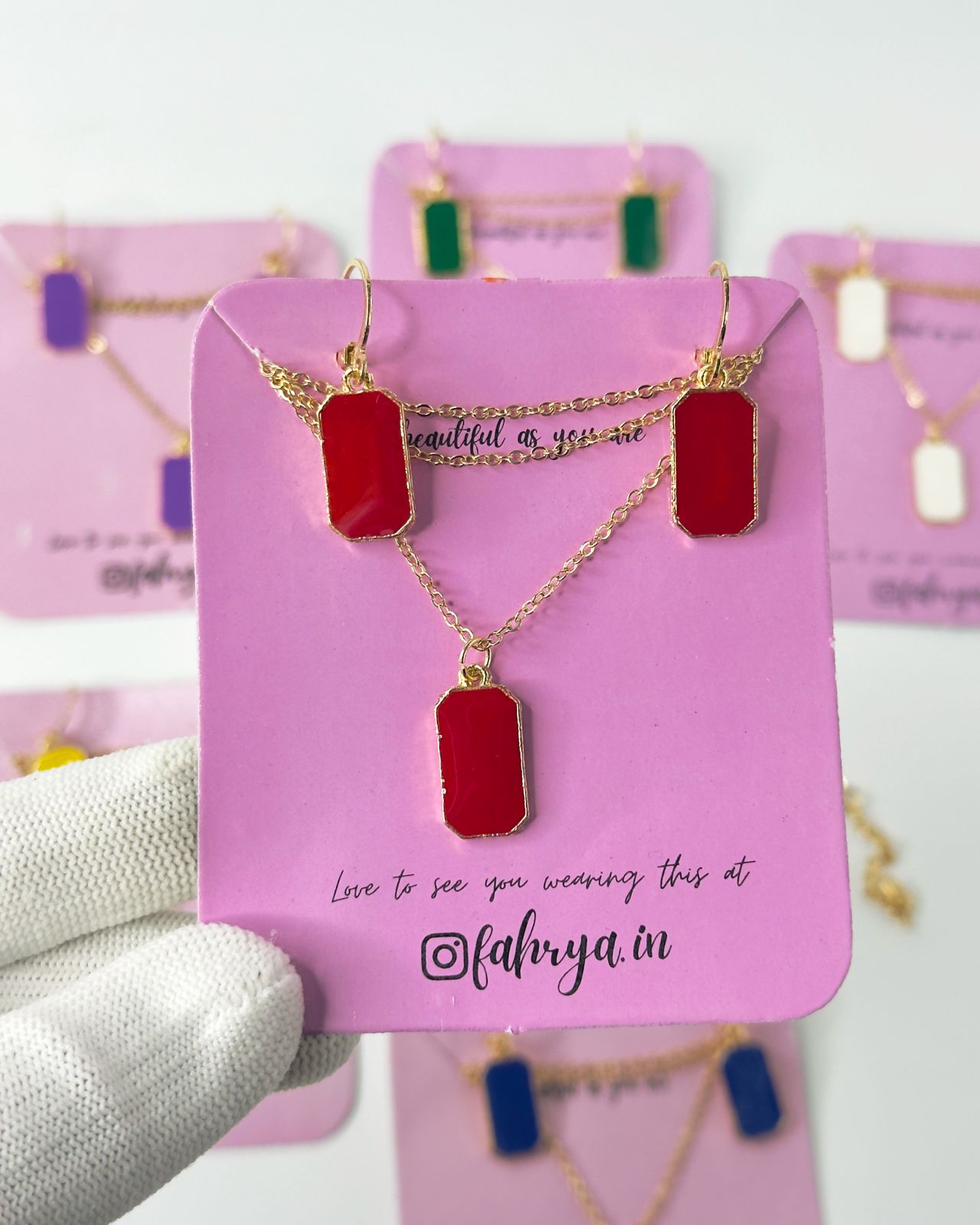 Minimal beautiful rectangle pendant matching necklace and earrings set in 7 different colors.