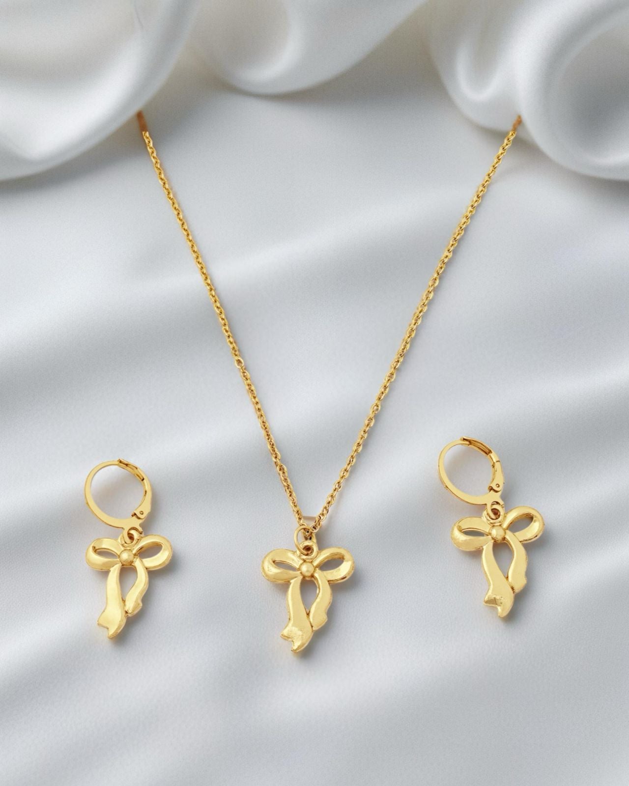 Matching chain necklace and earrings pair featuring a cute bow rose gold plated charm.