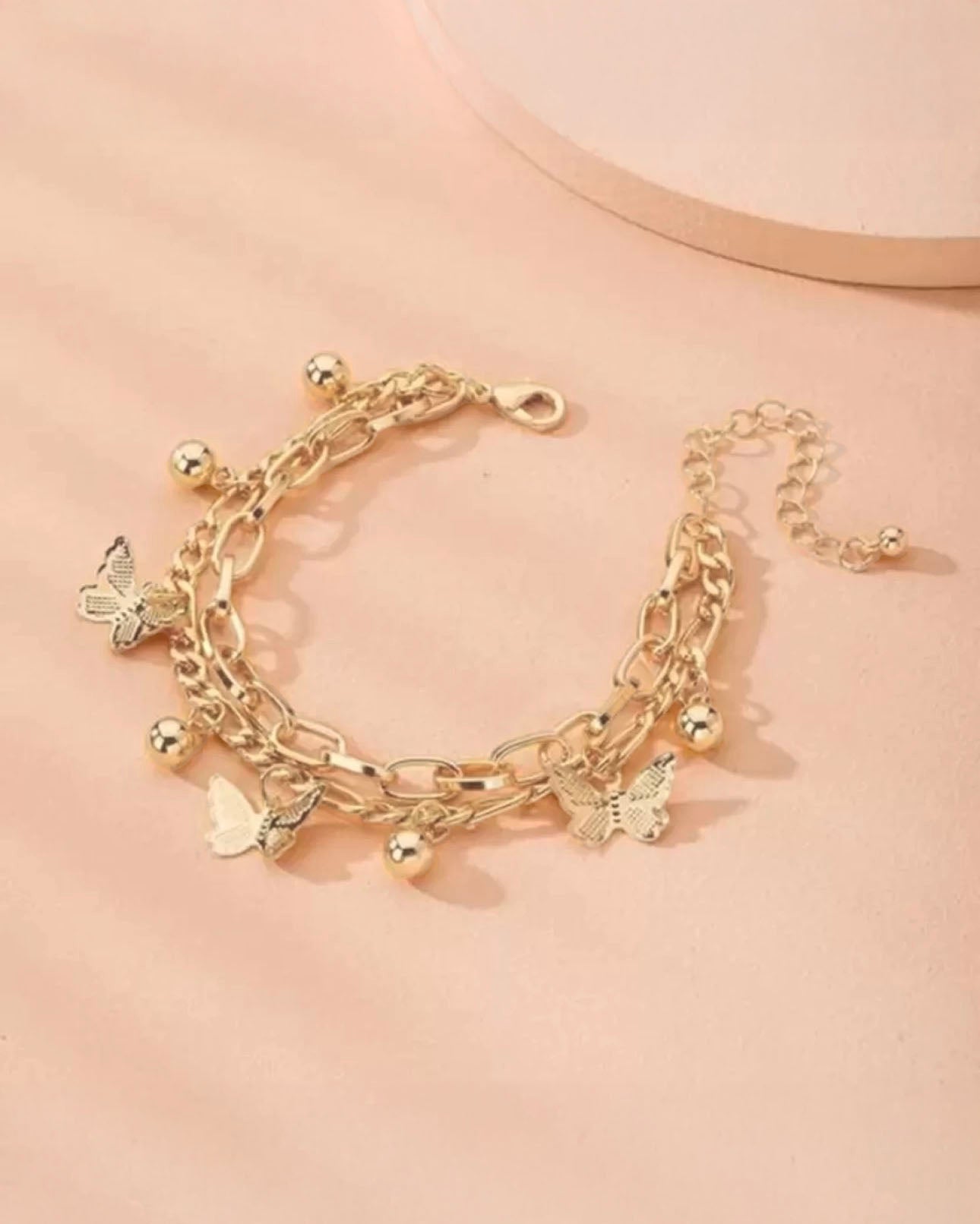 This refined double-layered chain bracelet combines with delicate aesthetics. The harmonious rose gold finish imparts a warm luminosity that complements various skin tones, while the butterfly charm—a symbol of transformation and beauty—serves as the centerpiece. The dual-chain construction offers enhanced durability without sacrificing elegance, creating a versatile accessory that transitions seamlessly between professional and social settings.