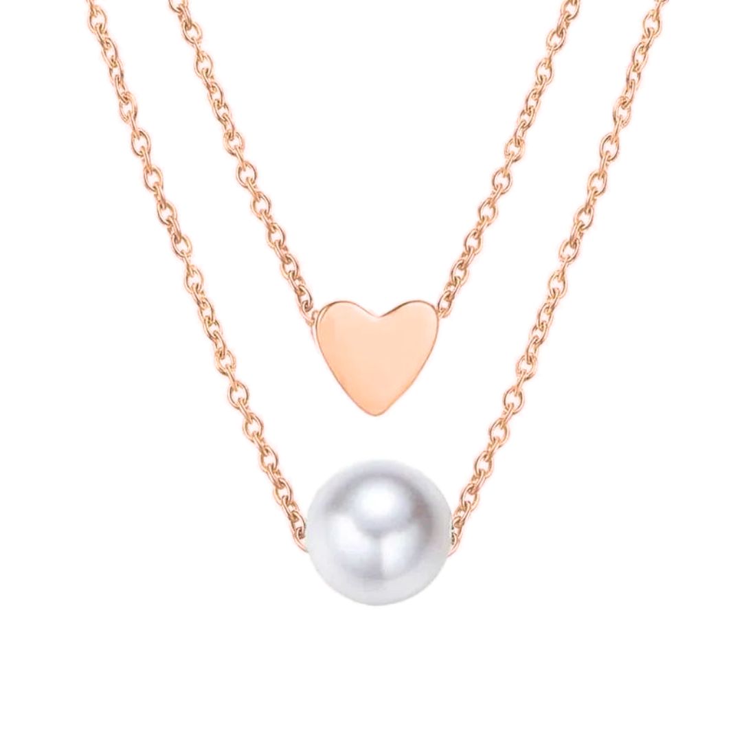 Small Heart & Pearl Double Rose Gold Layered Chain Necklace
